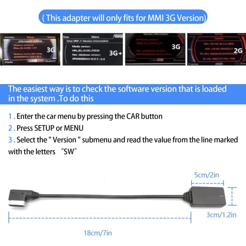 【Opmerking】 Het is een draadloze Bluetooth-muziekadapter voor Audi / VW met originele AMI-integratiesystemen. Bluetooth-adapter alleen voor Audi MMI 3G. Niet compatibel met MMI 2G of MMI 3G Plus of andere MMI-generaties Draadloze Bluetooth 5.0-module volledig compatibel met Audi MMI 3G-media-interfacesystemen. Controleer voordat u koopt of uw MMI-systeem een 3G+-systeem is.
