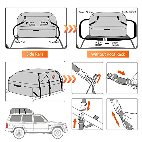 Hoge kwaliteit en waterdicht: de dakkoffer is gemaakt van waterdicht materiaal van hoge kwaliteit met ultra-sterke stiksels. De koffer is duurzaam, waterdicht en kleurvast. De koffer houdt je spullen droog en biedt bescherming tegen vuil, regen en sneeuw. (Er is geen rek, stang of spijker nodig)