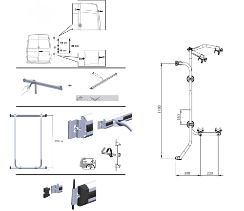 Speciaal voor Mercedes Sprinter en Volkswagen Crafter. Vooraf gemonteerd en afsluitbaar Frame van elektrisch gelast aluminium (hoogte 124 cm). Bevestiging met houders, siliconen en dubbelzijdige plakband aan de deur van de bestelwagen. Montage van de fietsen op stabiele aluminium profielen met 360 graden draaibare aluminium armen met rubberen bescherming, aanpasbaar aan buizen van 3-5 cm, ovale buizen van 16 cm (2,4-6,5 cm of ovaal tot 21 cm, optioneel).